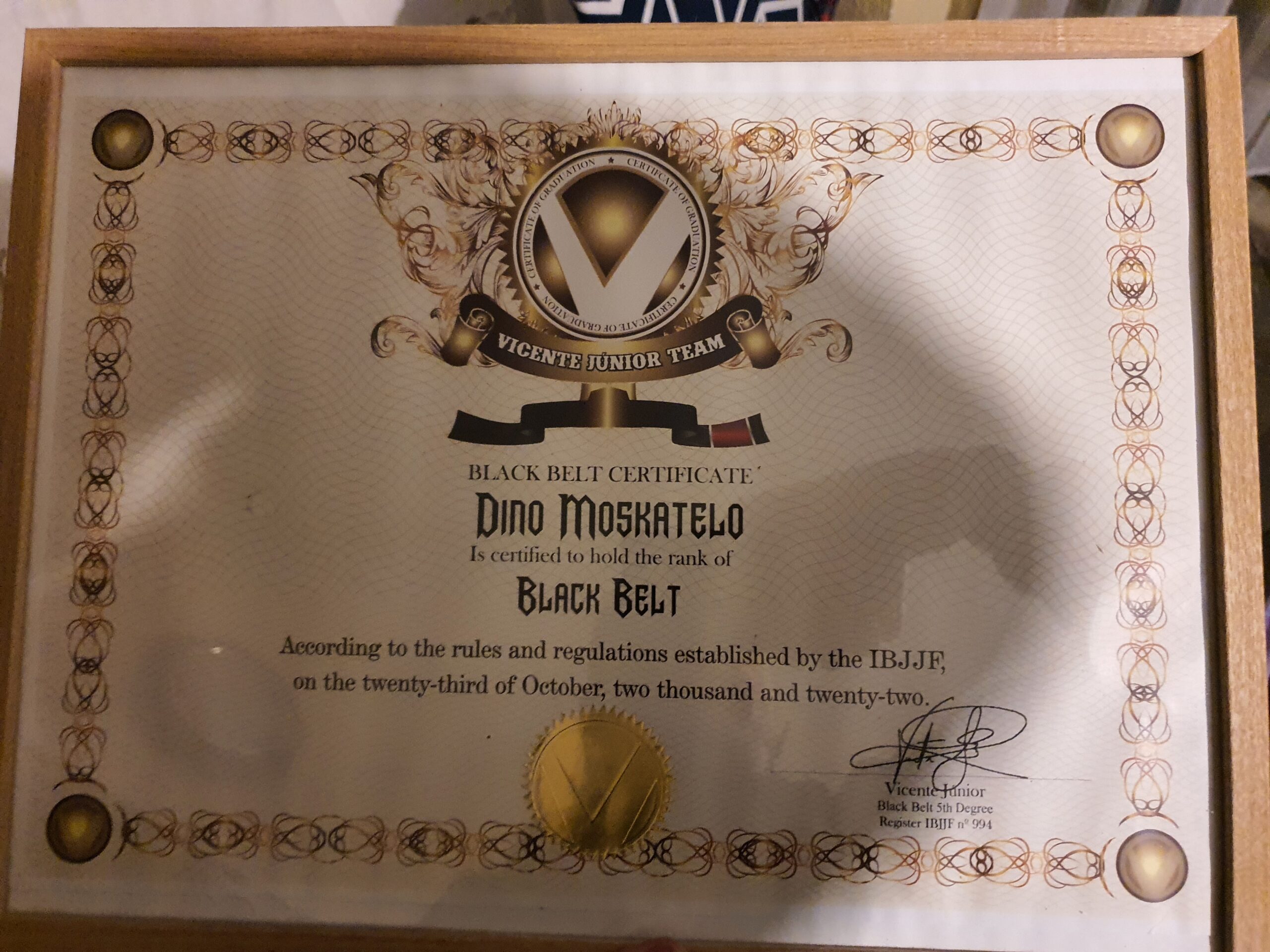 Dino Moskatelo je crni pojas pod Vicente Jr.-om iz Brazila promoviran u Splitu 2022. godine.